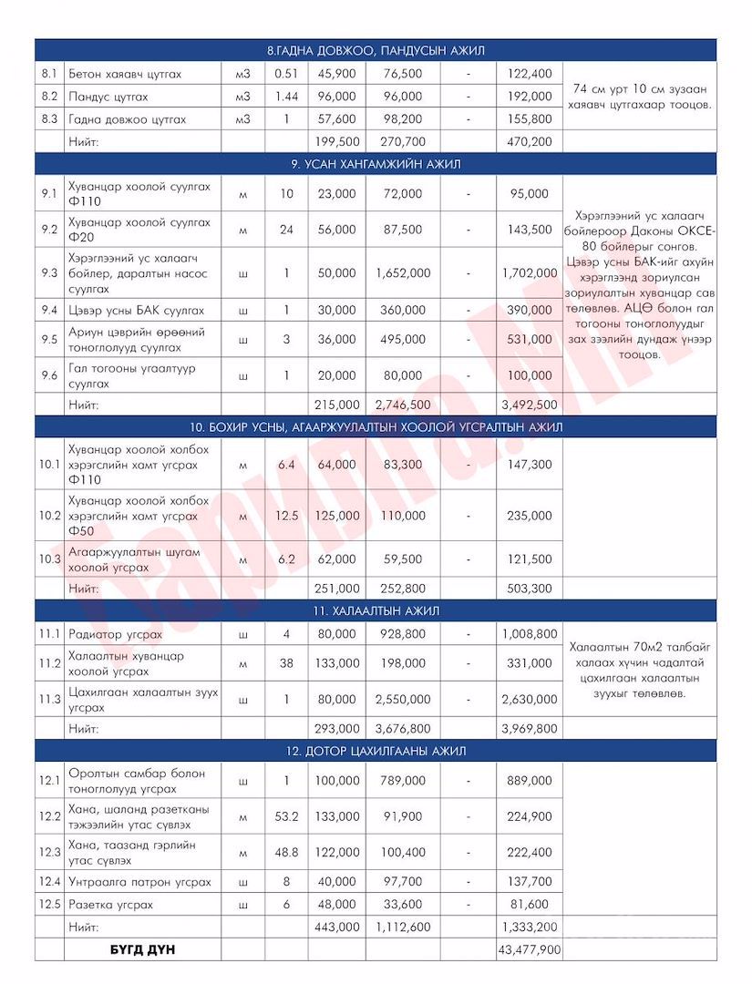 - Тус төсөвт захиалагчийн хяналтын зардал, зохиогчийн хяналтын зардал, норм нормативын сан, магадлашгүй ажлын зардлуудыг тусгаагүй болно.