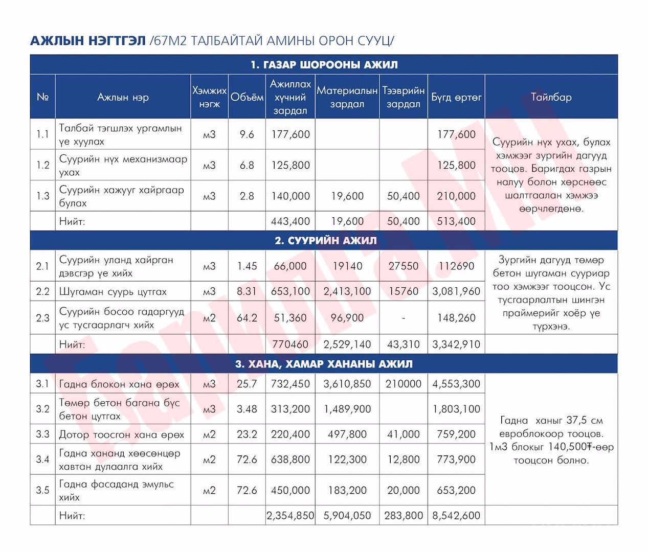 - Төсөвт өртгийг 67 ам метр талбайтай, Европ хэв маягийн амины орон сууцны гүйцэтгэлийн зураг дахь тоо хэмжээг үндэслэн тооцов. /Төсөвт өртөг 43,477,900 төг/